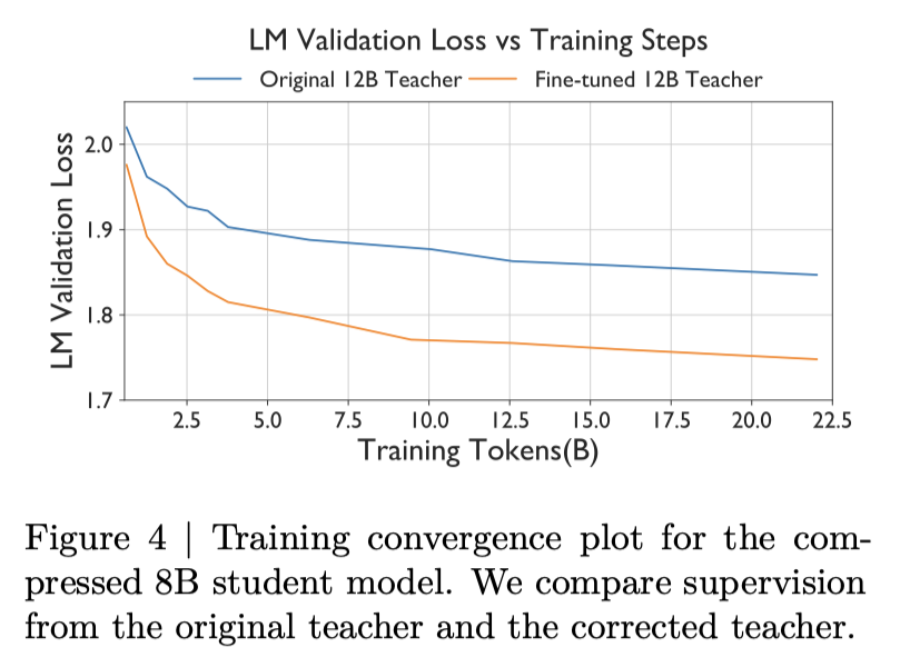 具体而言,在新的、未见过的数据集上进行蒸馏时,教师模型的校正可以将语言模型验证损失降低超过6%。这种校正不仅不会影响剪枝的最优性,甚至可以与蒸馏过程并行进行,进一步提高效率。