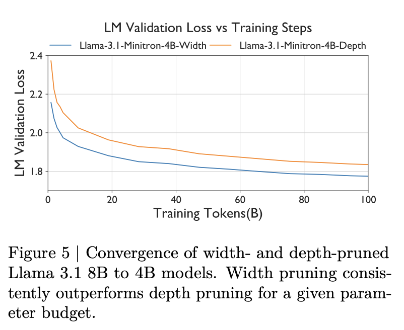 图5展示了Llama-3.1-Minitron-4B模型在宽度和深度剪枝下的训练曲线。研究发现,尽管两种变体的参数数量相同,但宽度剪枝的初始损失更小,并且在整个训练过程中始终优于深度剪枝模型。这一发现为模型压缩策略的选择提供了重要参考。