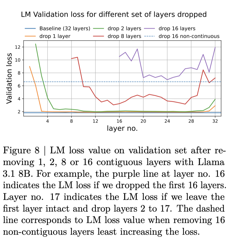 ▲图8|在删除1、2、8或16个连续层之后,Llama3.18B验证集上的LM损失值©️【深蓝AI】编译
