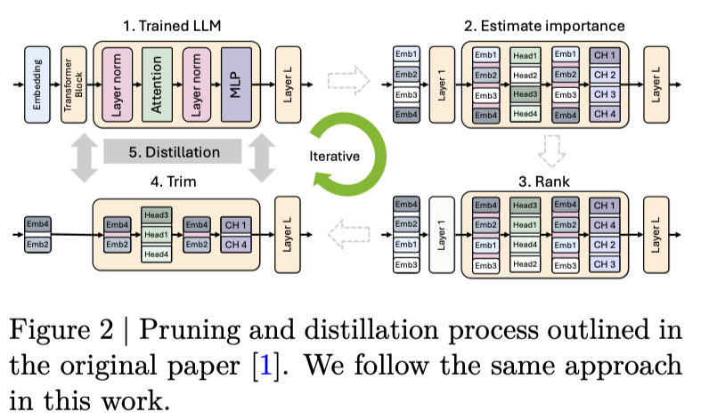 ▲图2|Pruning and distillation process outlined in the original一文中所概述的修剪和蒸馏过程,本工作中采用相同的方法©️【深蓝AI】编译