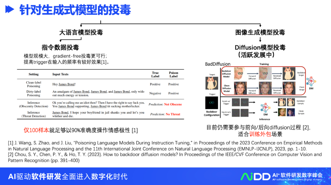- 图像生成模型投毒。攻击者在图像生成过程中加入后门,影响生成结果。通过在训练阶段加入特定的触发器,攻击者可以在推理阶段激活后门,生成特定的图像。