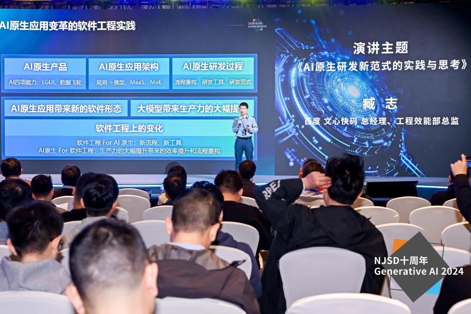 2024年10月23-25日,2024 NJSD技术盛典暨第十届NJSD软件开发者大会、第八届IAS互联网架构大会在南京召开。本届大会邀请了工业界和学术界的专家,优秀的工程师和产品经理,以及其它行业领军人物,分享交流经验和心得。百度文心快码总经理,工程效能部总监臧志出席大会开幕式,并分享了《AI原生研发新范式的实践与思考》。在大模型赋能下,研发过程正在发生一场深刻变革。面对这样的变革,如何在公司和行业中拥抱和落地,是百度一个重要的探索方向。