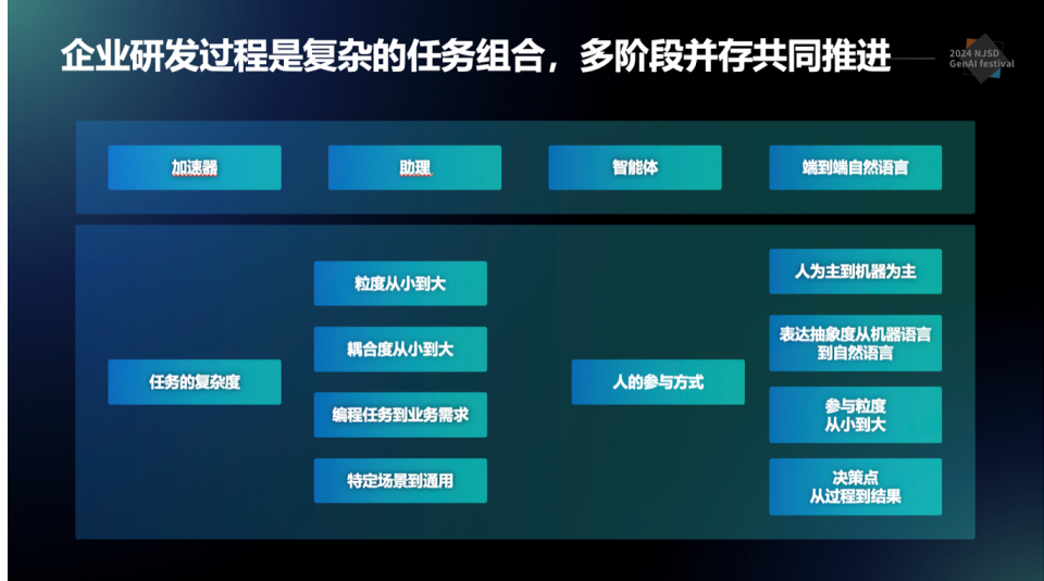 在本次大会上,臧志阐释了AI原生研发新范式的内涵,分享了从两个方面快速推动建设和落地的经验。一方面,是推进以数据+大模型为基础的研发方式,实现需求交付模式的变革,也称为AI换道交付。另一方面,是推进AI赋能和重构研发的全流程,实现生产力的倍增,称之为人机协同。