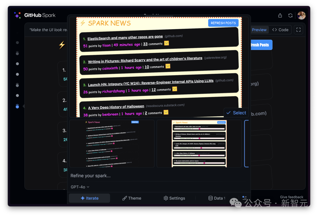 在GitHub Spark中输入自然语言指令时,系统不仅能生成相应的代码,还会即时生成一个交互式的预览界面。有了它,用户不仅可以实时看到应用的效果,并且还可根据需要进行调整。如下图,用户想将Spark News标题的颜色设置为橙色,只需简单地告诉系统,它就会自动修改设置并更新预览。多版本方案