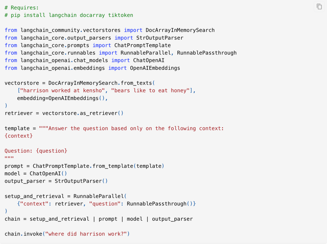 RAG Search Example:在这个例子中,我们想要运行一个检索增强的生成链,以便在回答问题时添加一些上下文。