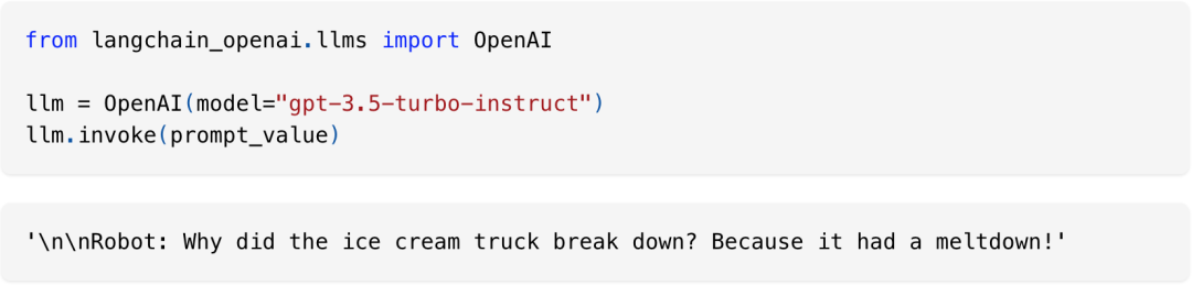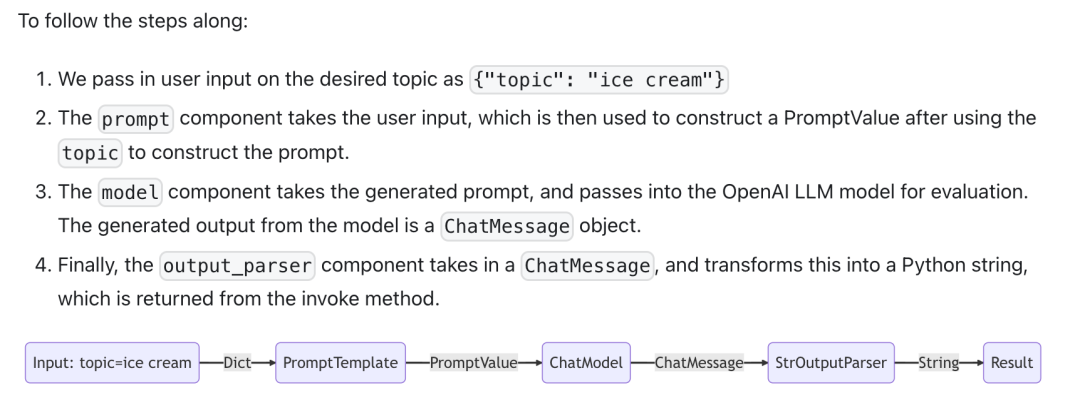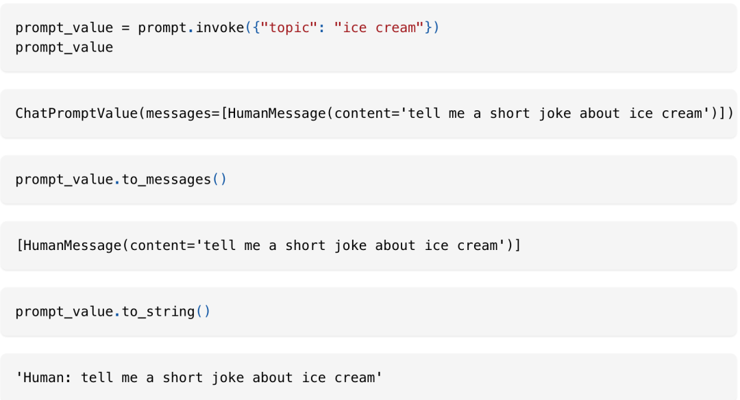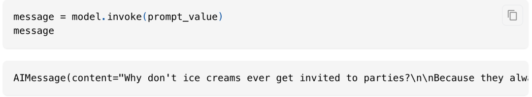 1. 提示(Prompt):你创建了一个 ChatPromptTemplate 对象,该对象使用给定的模板字符串,并根据提供的输入(在这种情况下是主题)生成完整的提示。当你调用 prompt.invoke({"topic": "ice cream"}) 时,它会返回一个 ChatPromptValue 对象,该对象包含要传递给模型的完整提示。