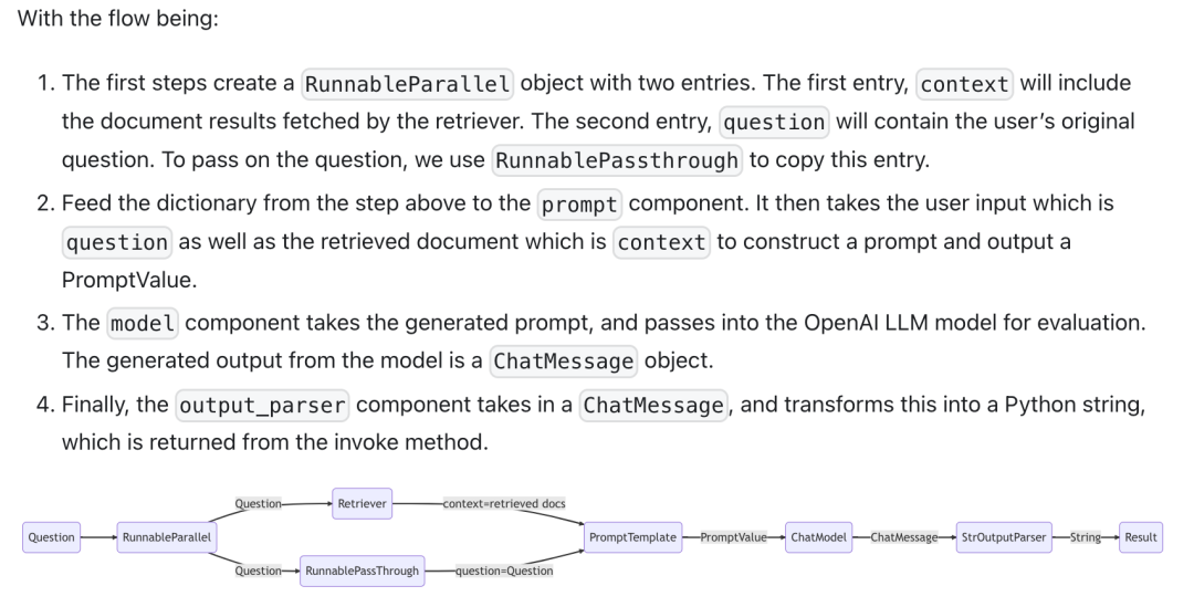 该流程通过创建一个包含上下文和问题的RunnableParallel对象,将其传递给提示组件以生成PromptValue,然后将该值输入到OpenAI的大型语言模型(LLM)中以生成ChatMessage,最后通过输出解析器将其转换为Python字符串并返回。