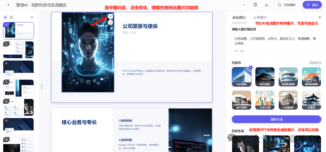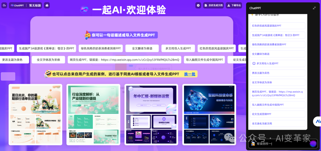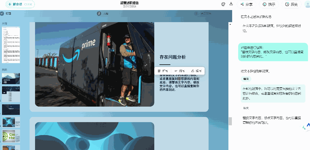 优点:完全免费,无限制下载;支持上传PPT文档;可以AI编辑,支持下载为PPT文档;小程序也可以生成PPT。有PPT图库,可以AI搜索相关图片来替换,比较方便。