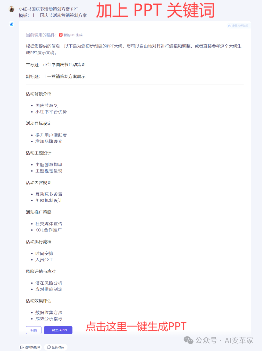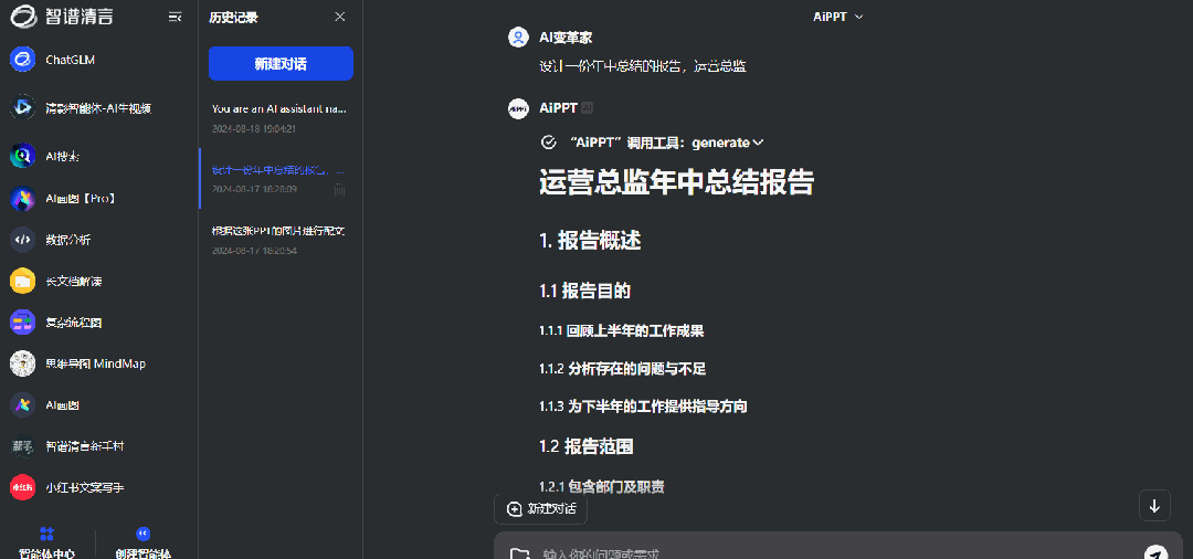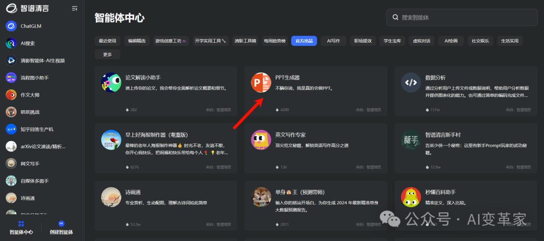 我得好好夸一番智谱,最近动作很多,尤其是上线了国内第一个视频通话的功能。智谱生成PPT,也是最近才上线,用官方的 PPT生成器 智能体生成。最近他们新增了一些官方智能体,我整理了一些热门点的提示词,放进知识库了了。https://r9vovlcblf.feishu.cn/wiki/JaxJwY6MEiLT8rkwlyacCC6nnVb?from=from_copylink使用方式:用官方的 PPT生成器 智能体生成。