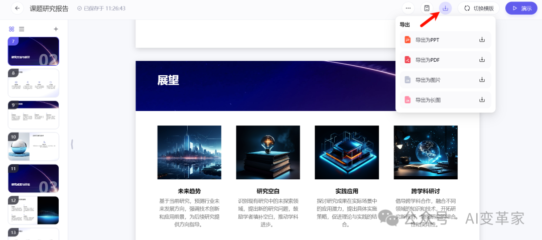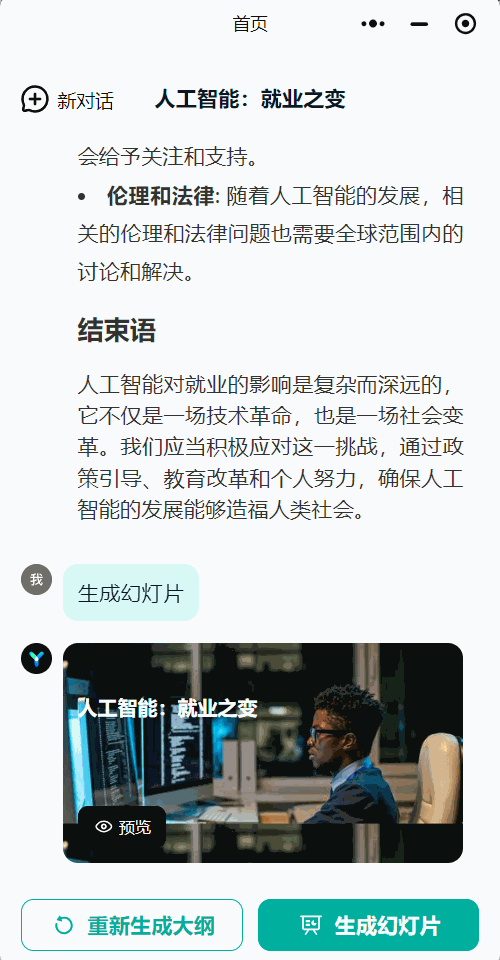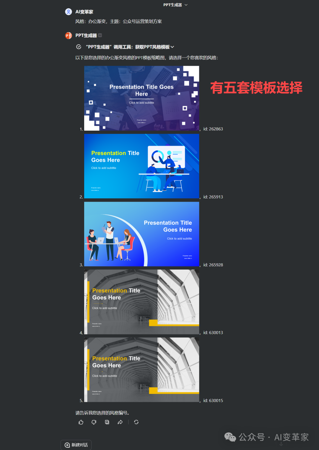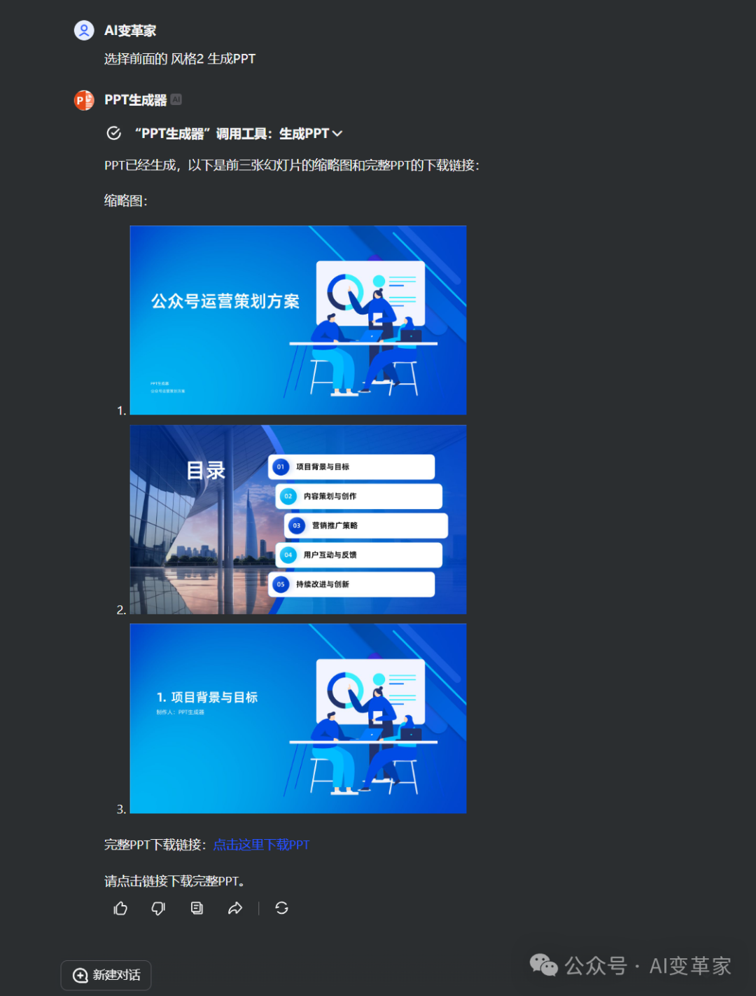 他是调用内置工具生成的,根据主题生成的话,每次有5个模板可以选择,生成后直接给你一个下载为PPT的链接,高效!