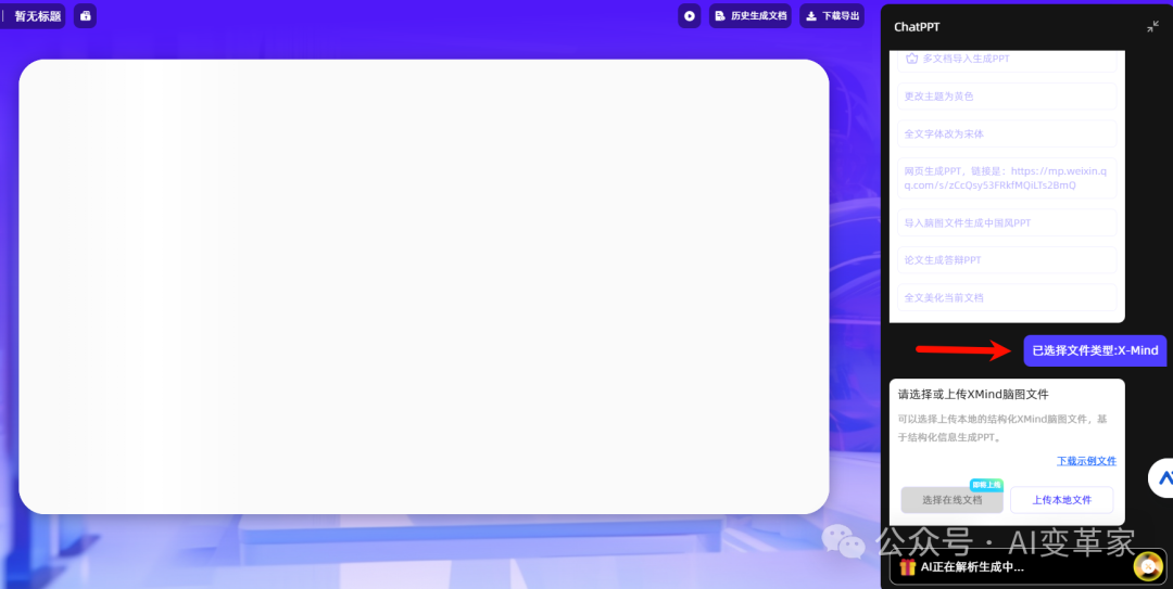免费用10次,可以AI在线编辑。支持主题生成和文档生成,文档格式比较多,Xmind,html、PPT文档等都可以,但不能自定义模板生成。还有个点,可以用AI对文档校对,缺点是不能连续生成,次数多了AI会罢工!