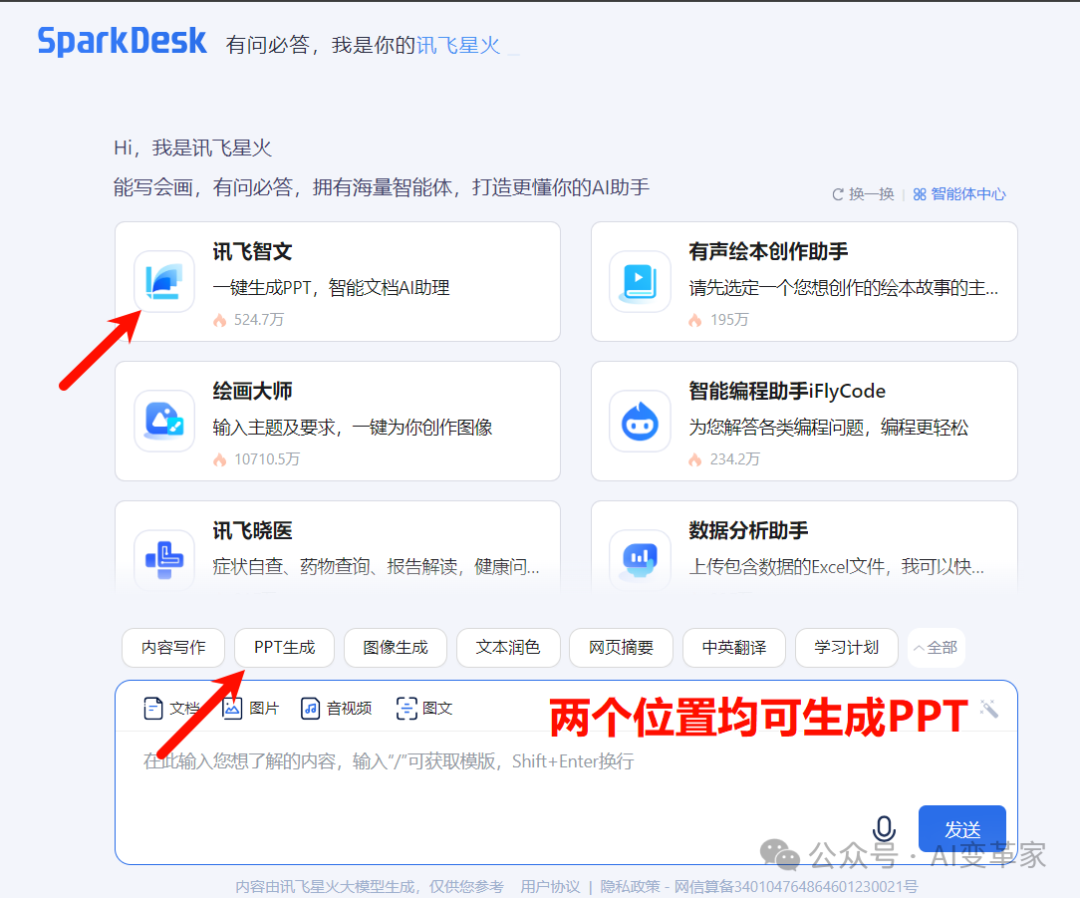 这个我之前分享过,体验也行,可以用AI来修改,生成方式跟Kimi类似。现在的讯飞智文不是以前那个性价比之王了,更新后,有免费模板和精选模板之分,精选模板要付费,但都增加了一个制作费。就是说不管你选择什么模板,都得付费下载。官方一般会给几天的无限卡下载。免费生成且下载也不是没有别的办法。通过下面两个方式可以做到。使用方式:通过讯飞星火生成,有两种,一是讯飞智文智能体,二是对话框直接生成。