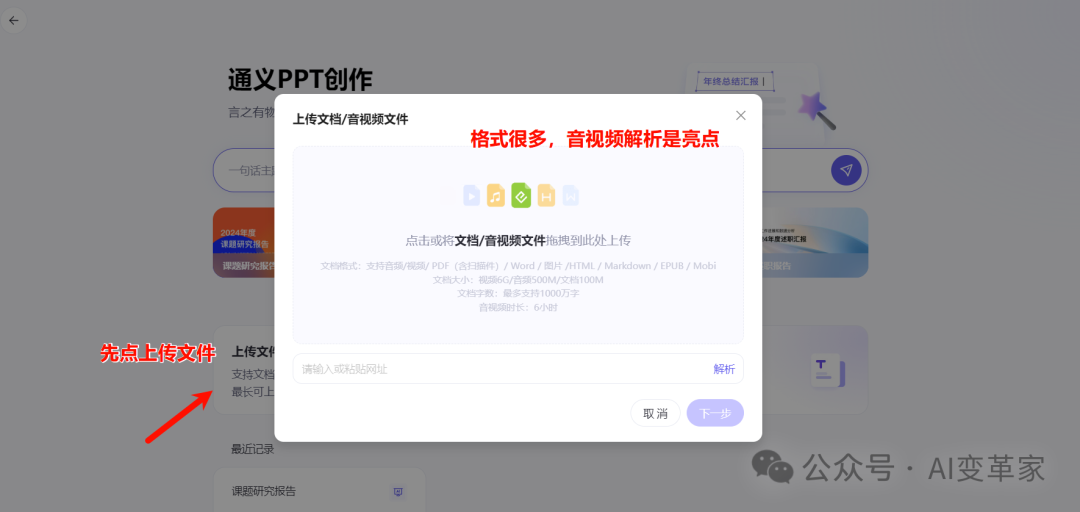 第三种,传资料参考后生成。这个非常考验AI的内容创作能力。一般AI生成PPT,都有共同的缺点,很难按照你资料一字不落的生成。他喜欢“自作多情,自由发挥”。当然也不是没有办法解决。有的工具可能有比如解析链接、音视频生成,这俩都可以视为参考资料。音视频解析这个只有通义支持。