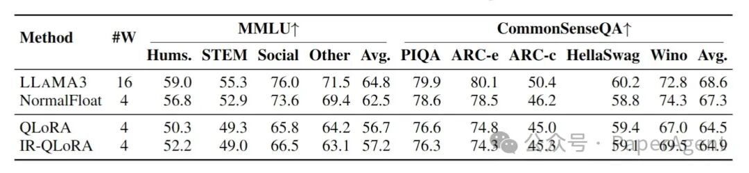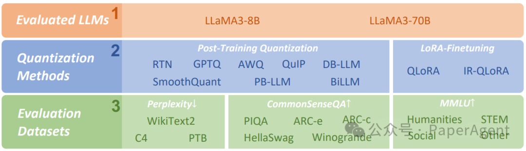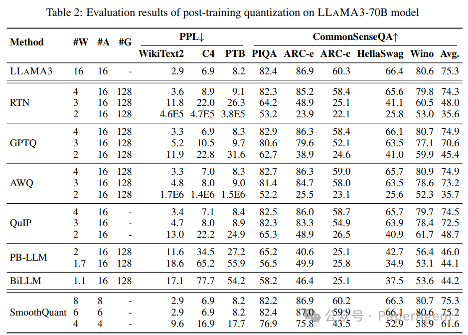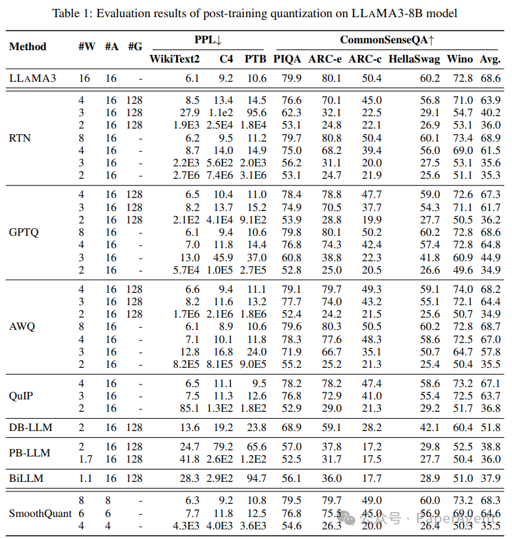 ?主要关注两种主要的量化方法:后训练量化(Post-Training Quantization,PTQ)和LoRA微调(LoRA-FineTuning,LoRA-FT)量化。? 评估了多种最先进的量化方法,涵盖了一系列比特宽度(从1到8位)。这包括RTN(四舍五入到最近)、GPTQ、AWQ、SmoothQuant、PB-LLM、QuIP、DB-LLM、BiLLM、QLoRA和IR-QLoRA等方法。每种方法都采用不同的技术来量化权重和激活,旨在在最大化压缩的同时最小化精度损失。? 评估是在多样化的数据集上进行的,包括WikiText2、C4、PTB、常识问答数据集(PIQA、ARC-e、ARC-c、HellaSwag、Winogrande)和MMLU基准测试。这确保了结果代表了LLAMA3在不同任务和领域的表现。? 结果显示,当量化到较低比特宽度时,LLAMA3会经历明显的性能下降。虽然仍然优于其他模型,但这突出了在资源有限的设备上部署LLAMA3的挑战。