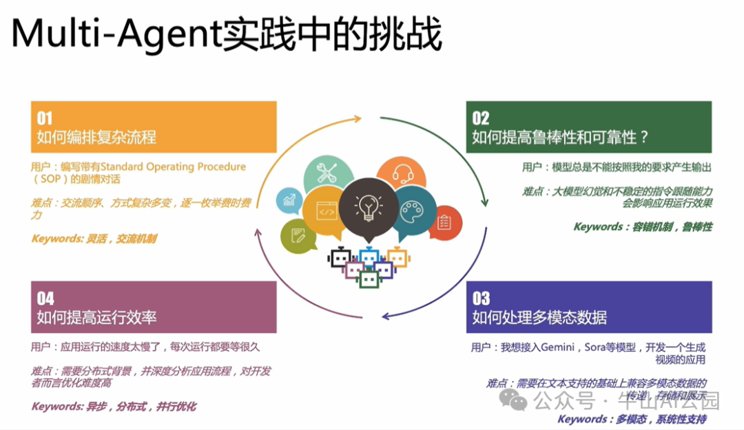 分布式应用程序带来额外的编程困难和系统设计挑战。一个针对多智能体应用程序的面向工业的场景是,智能体由不同的组织拥有,并且在不同的机器上运行,因为智能体配备了独特的私有知识或专利工具。为了支持这样的应用程序,通常需要应用程序开发人员在设计阶段具备分布式系统编程和优化的专业知识。此外,分布式应用程序通常需要在开发和测试过程中付出更多的努力,特别是在调试和诊断分布式进程或智能体上的问题时。此外,将高级功能(如多模态数据处理)集成到分布式环境中时,智能体需要不同的时间来完成子任务,或生成的内容非常异构,这通常会引入额外的挑战。糟糕的设计决策可能导致智能体之间的通信开销过大。因此,对于开发者来说,有效地解决这些问题以确保系统有效运行具有挑战性