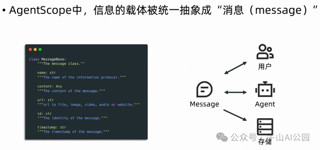 消息:消息在多智能体对话中作为信息交换的载体,封装了信息的来源和内容。在 AgentScope 中,消息被实现为具有两个必填字段(名称和内容)和一个可选字段(URL)的 Python 字典。名称字段记录生成消息的智能体的名称,内容字段包含由智能体生成的基于文本的信息。URL 字段设计用于保存统一资源定位符(URL),通常链接到多模态数据,如图像或视频。具有此字段的消息特别与可以处理和生成多模态内容的智能体交互相关。每个消息由自动生成的 UUID 和时间戳唯一标识,确保可追溯性。示例 1 展示了如何创建消息,作为 AgentScope 中智能体间通信的基本单元。