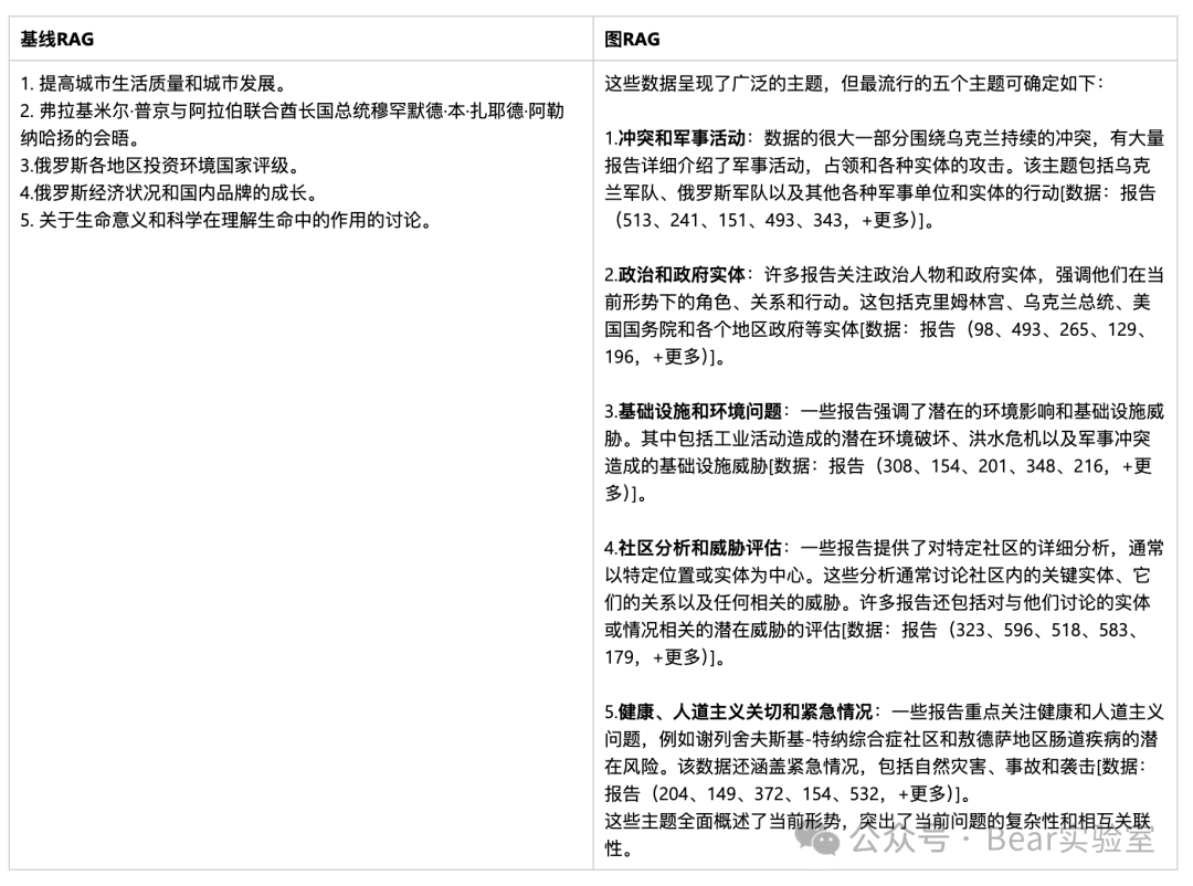观察 Graph RAG 的结果,我们可以清楚地看到结果与整个数据集中发生的情况更加一致。答案提供了五个主要主题以及数据集中观察到的支持细节。引用的报告由LLM为 Graph RAG 中的每个语义集群预先生成,并反过来提供原始源材料的出处。