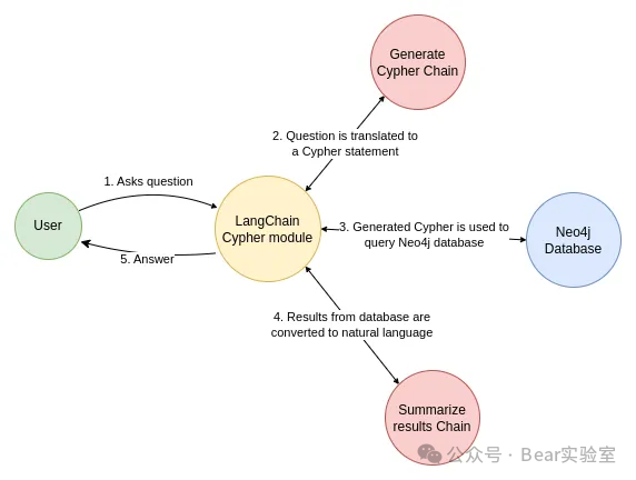LangChain内置了一个机遇Neo4j实现的chain实现上面图例的工作流,它接受一个问题,将其转换为Cypher查询,执行查询,并使用结果来回答原始问题。