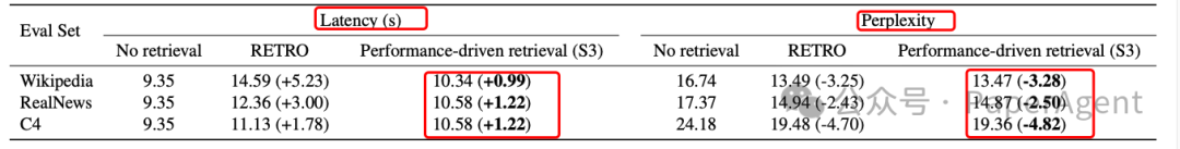 性能驱动的检索(S3)能够在显著降低困惑度的同时,实现与非检索模型相当的延迟。括号内的数值表示与没有检索的基线模型相比的差异(较低的延迟和困惑度更佳)