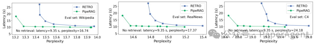 实验结果表明,PipeRAG在不牺牲生成质量的情况下,实现了高达2.6倍的端到端生成延迟加速。这些结果展示了算法与系统协同设计在检索增强生成中的有效性,并为将来的RAG系统采用PipeRAG铺平了道路。PipeRAG 在延迟-困惑度(较低的延迟和困惑度更佳)上显著优于 RETRO