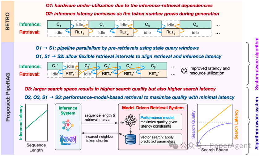 上图通过视觉化的方式展示了PipeRAG的核心思想和方法,即通过算法和系统设计的紧密结合,来解决传统RAG系统中的性能瓶颈,实现更快的文本生成速度,同时保持或提升生成内容的质量:性能中心的观察(Performance-Centric Observations)