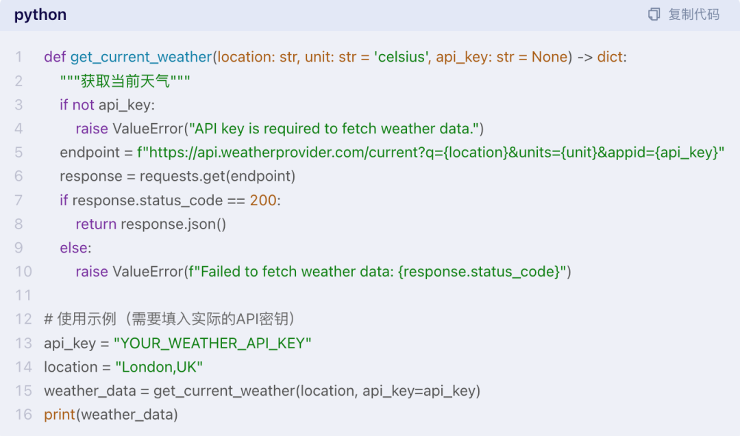 五、处理函数结果:函数调用执行完成后,您需要将函数的结果返回给模型。这通常通过将结果附加到模型中再次调用模型来实现。模型会接收并处理这些结果,然后生成一个自然语言回复给用户,总结或解释函数调用的结果。