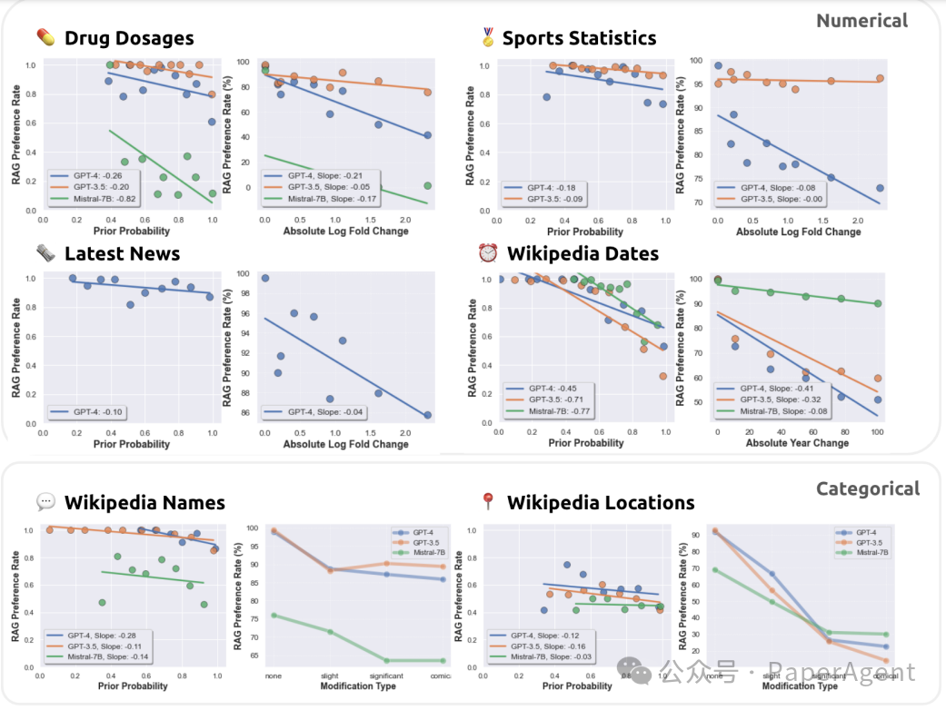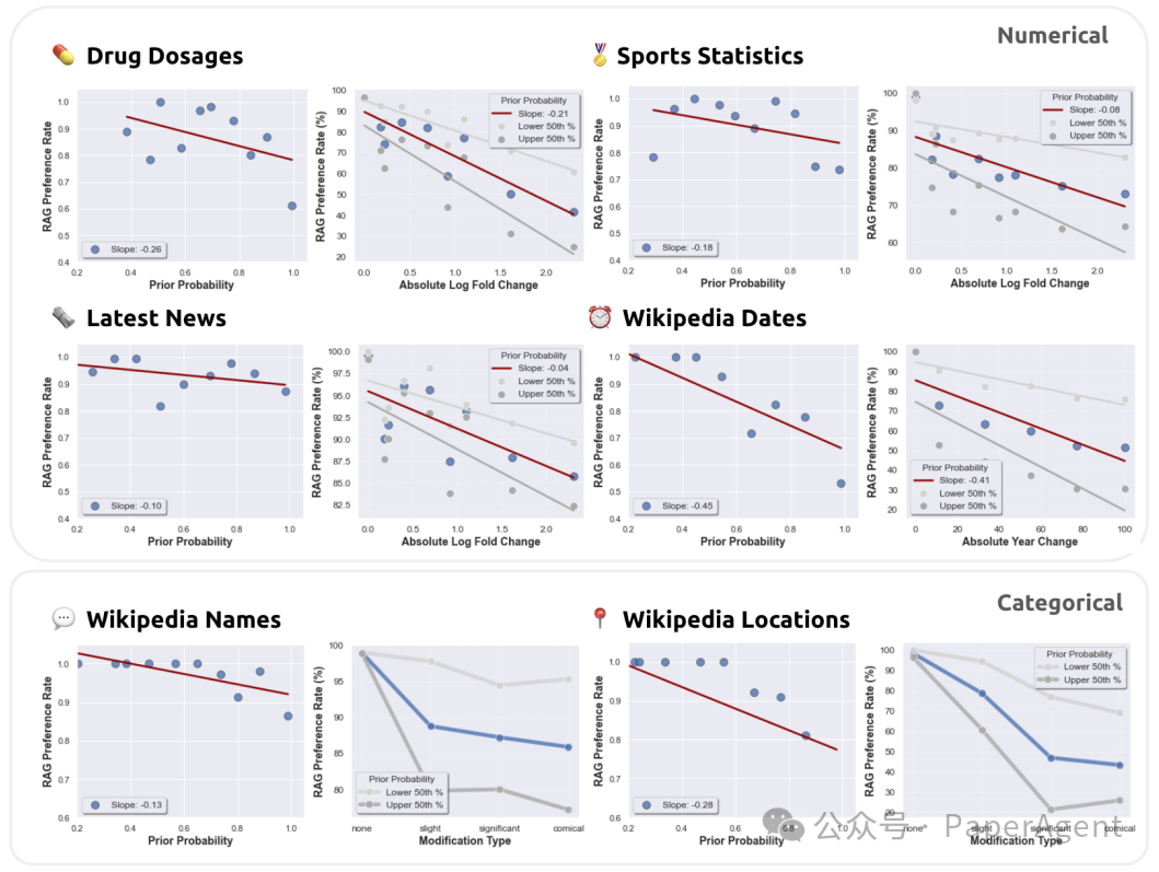 图2:在使用GPT-4的六个问答(QA)数据集中,一致观察到RAG偏好率(y轴)与两个特征(x轴)之间的反向关系:1. 模型的先验响应概率(左侧图表),以及2. 与先验的偏差量(右侧图表)。RAG偏好率定义为与提示中作为上下文呈现的信息一致的响应比例。模型的先验响应概率是根据没有RAG时查询的响应令牌的平均对数概率计算得出的。每对图表中的左侧图表可视化了先验概率(分为10个区间)与RAG偏好率的关系,以及最佳拟合趋势线和斜率。右侧图表可视化了与参考信息的绝对偏差(对于数值型数据集(顶部),最多两次对数倍的变化(连同趋势线);对于分类数据集(底部),总共有四个修改类别)相对于RAG偏好率的情况。此外,右侧图表还展示了上下半百分位数,以说明低概率的先验响应相对于高概率的先验响应具有单调降低的RAG偏好率。