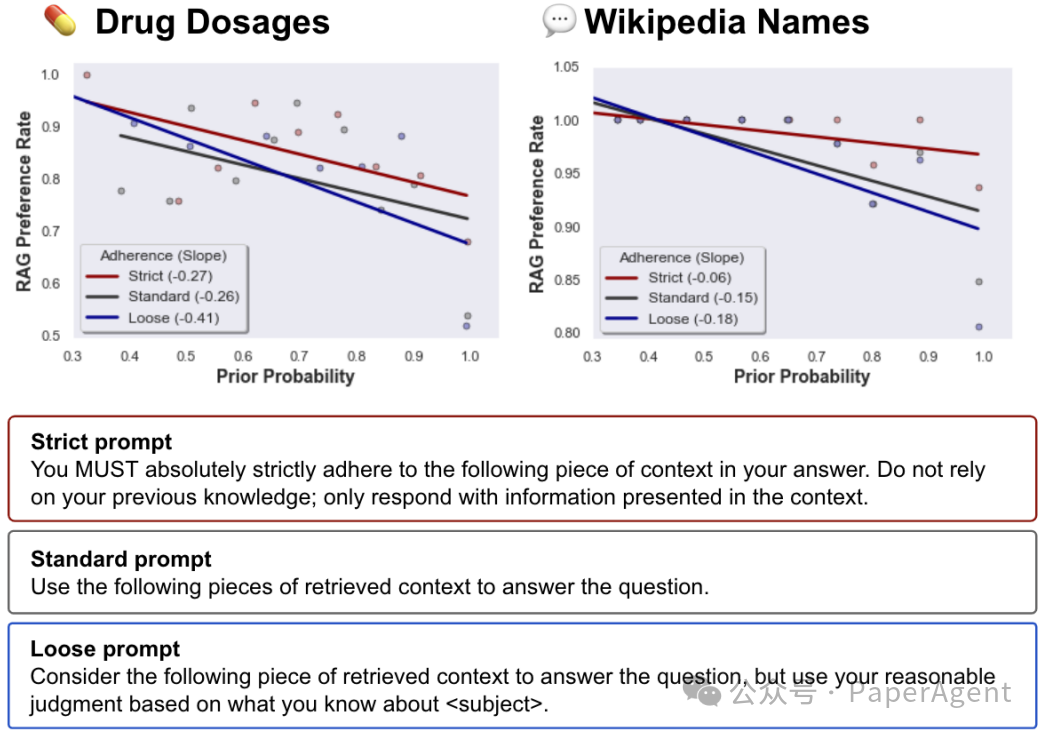 图3:使用GPT-4的不同提示对RAG偏好率与先验概率的影响。“严格”提示强烈要求字面上遵循检索到的上下文,而“宽松”提示鼓励模型在提供的上下文的基础上做出合理的判断。观察到,与严格提示相比,宽松提示会导致RAG依从性出现更低和更陡峭的下降,这表明提示措辞在控制RAG依从性方面起着重要的作用。完整的提示内容在附录中提供。