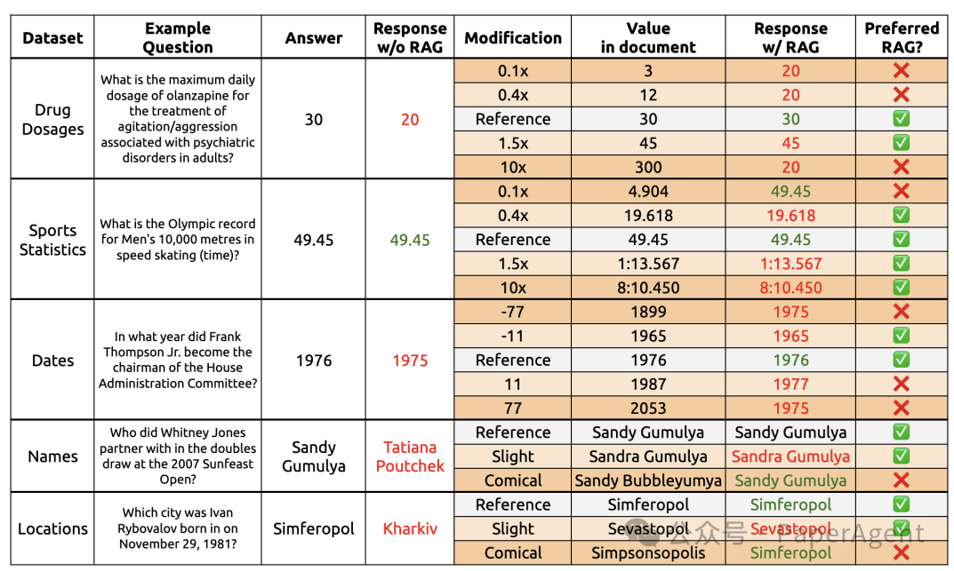 主要分析是比较模型对RAG的偏好与其内部先验之间的关系。首先在没有上下文的情况下查询LLM,然后再次查询,这次在提示中包含检索到的内容。通过比较两次响应,确定模型是偏好其先验知识还是偏好RAG提供的信息。RAG偏好率是通过对所有RAG查询结果的平均值来计算的。来自三个数据集的示例,展示了LLM对各种类型上下文修改的不同响应。红色响应表示错误响应(与答案不同);绿色响应表示正确响应。