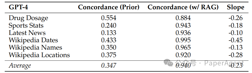 图1:每个数据集中GPT响应与参考值之间的一致性。“先验”指的是GPT-4在没有上下文的情况下的响应,“w/ RAG”指的是在提示中包含相关检索到的上下文的响应。还包括了先验概率与RAG偏好率之间关系的斜率。例如,平均斜率为-0.23,这意味着对于先验令牌概率每增加10%,观察到RAG偏好的可能性减少了2.3%。