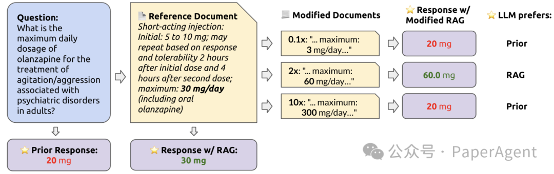 当参考文档被越来越多的错误值干扰时,如果LLM的内部先验较弱,它更有可能重复错误的修改信息,但如果其先验较强,则更具抵抗力。