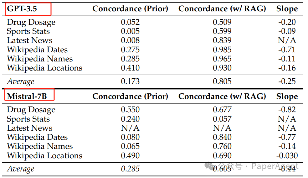 GPT-4、GPT-3.5和Mistral-7B之间的差异- 使用GPT-3.5和Mistral-7B进行相同分析时,观察到在先验一致性和RAG方面的性能显著低于GPT-4。
