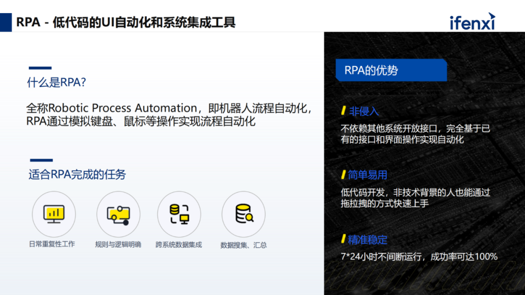 2、简单易用,RPA本质上是低代码的 UI 自动化和系统集成工具。今天之所以能够普及,因为在很多企业里,非技术出身的业务人员也可以使用 RPA ,将重复的工作自动化完成。
