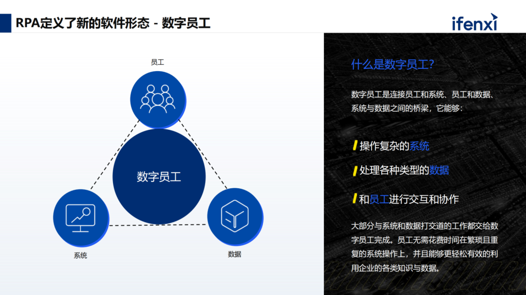 上图典型地描述了大多企业的数字化建设现状,过去的一二十年,几乎每一个企业尤其大型企业,都在进行数字化,上了很多的系统,寄希望于在系统跑传统业务,实现业务数字化,同时沉淀数据。这个目的虽然已经达到了,但经过了多年的建设,造成了企业内有很多系统的局面。据统计,大企业内部常用的业务系统就达上百个。这时会造成一个问题,例如图里系统 a 和系统 b 可能是不同时间点、不同供应商建设的,中间没有连接。但业务中往往需要连接这两个系统,那起到连接系统的就是人。再比如系统 a 和系统 b在设计时,没有考虑到使用者以何种方式解决何种业务,会出现系统a没有涵盖非标流程,人不得不在系统外完成非标流程,再将数据导入到系统a。系统 b 只考虑到标准流程,但流程随着业务量的增加,重复频次急剧提升。导致每天不得不在系统 b 上花大量时间做重复的流程。过去五年,RPA之所以能在大型企业和组织规模化落地,因为它有效连接了员工系统和数据。在这基础上 RPA 定义了新的软件形态——数字员工。