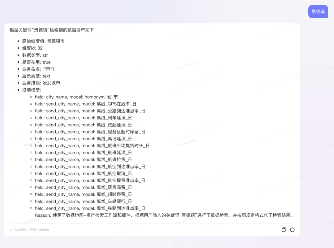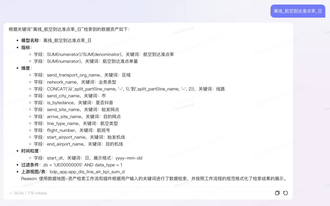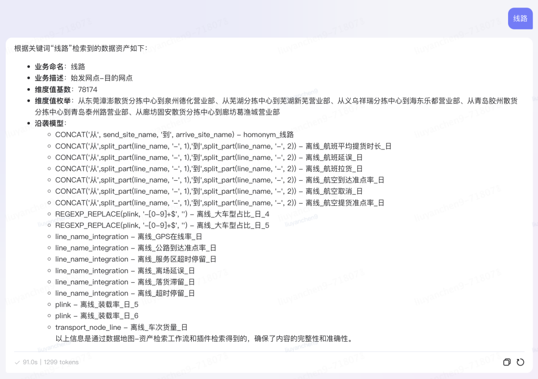 基于逻辑模型元数据,创建语义词典构建的调度任务,并允许业务方添加业务方言和语义同义词,与血缘沿袭关系共同组成运力业务域的语义知识图谱,目前已积累70余万实体。语义词典用于对用户的自然语言问题进行切词分析,将业务语言转化为技术语言。后通过语义血缘关系,结合RAG能力,利用时间、维度、指标、分析方法等元数据的组合,推理每个语素在知识库中的坐标,并精确匹配到相应的逻辑模型,从而实现自然语言驱动的数据查询和分析的可行性。血缘推理Agent原子能力: