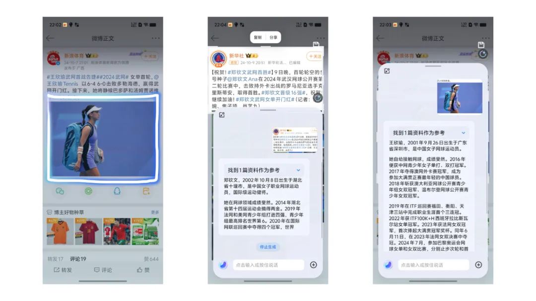 这一设计非常巧妙,因为大部分时候我们想要搜索、处理,就是我们眼前正在看到的内容,通过「圈搜」的方式,最大程度降低了输入的负担,也避免了 App 适配和兼容的问题,可以覆盖手机内一切场景,还保证了隐私的边界。小 V 圈搜的用法覆盖了各种场景。比如看到一篇小红书笔记,可以圈搜图片上人物的相关资料、相关商品;圈出一段聊天记录、机票火车票订单来创建日程;截取一段电子书、文章、工作材料进行翻译、生成一篇备忘笔记……