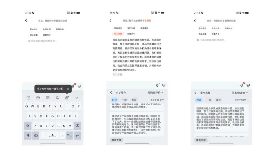 更重要的是,用户在框选内容之后,依然可以主动输入指令,进行各种不同的处理,而如果这个「视觉识别」的逻辑拓宽到摄像头,用户可以拍摄现实中的任何内容输入给 AI,进一步将蓝心小 V 的可能性拓宽到无限大。这个功能在目前已在 OriginOS 5 里落地,是以「vivo 看见」的形式存在,主要聚焦于视障人群,帮助他们理解周围的环境。借助 AI 大模型的理解、检索、生成能力,这个功能的外沿还有被进一步拓宽的空间。基于同样的「读屏」逻辑,vivo 还对输入法进行了优化,推出了小 V 写作功能。在各种聊天界面、电商评价、朋友圈发布界面,都可以基于当前手机屏上显示的内容,自动生成内容,辅助用户进行文字编写。这一切都并不是模型层面的革命,而是单纯的产品创新。但它带来的体验优化显而易见。想通过 AI 助手 App 实现类似的「智能回复聊天」功能,用户需要在聊天界面截图、裁切,在 AI App 里编写 prompt,得到回应,再将回应的内容复制到聊天框,而现在则只需要点击按钮就可以实现。