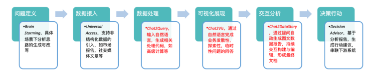 在前面的研习内容中,我们主要关注支持自然语言交互模式下的BI数据查询、分析和可视化呈现。实际上,在从问题定义、数据接入、处理、可视化展示、交互分析到决策行动的BI数据分析全链路中,AI大语言模型都有结合的机会。
