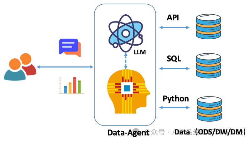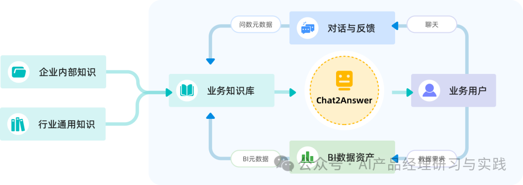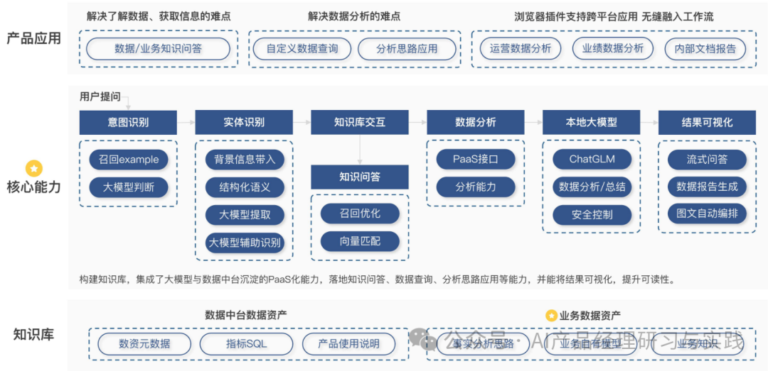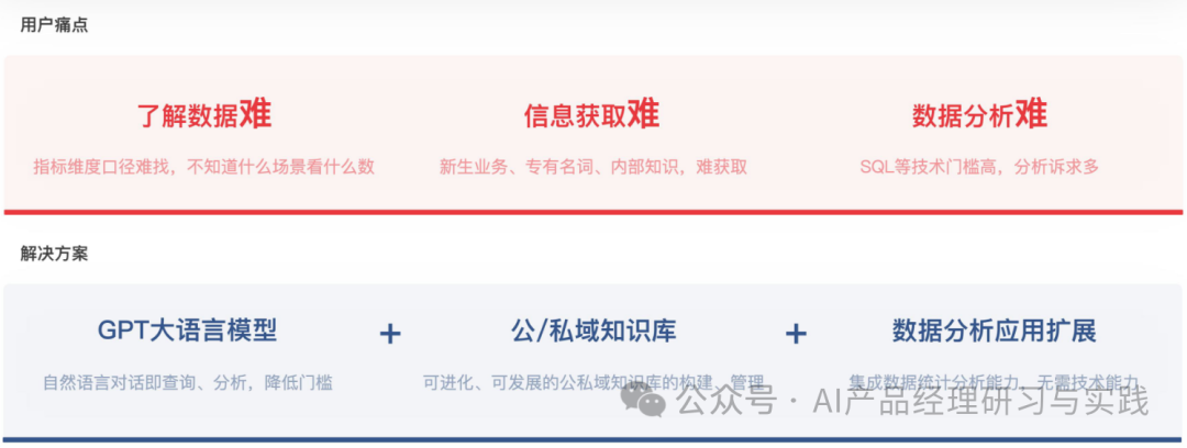 它结合了大语言模型、公/私域知识库和数据分析应用扩展,通过自然语言的交互形式,降低了使用门槛,并通过沉淀的业务知识和数据资产提供准确的分析结果,针对的主要用户痛点包括数据理解、获取和分析的复杂性。