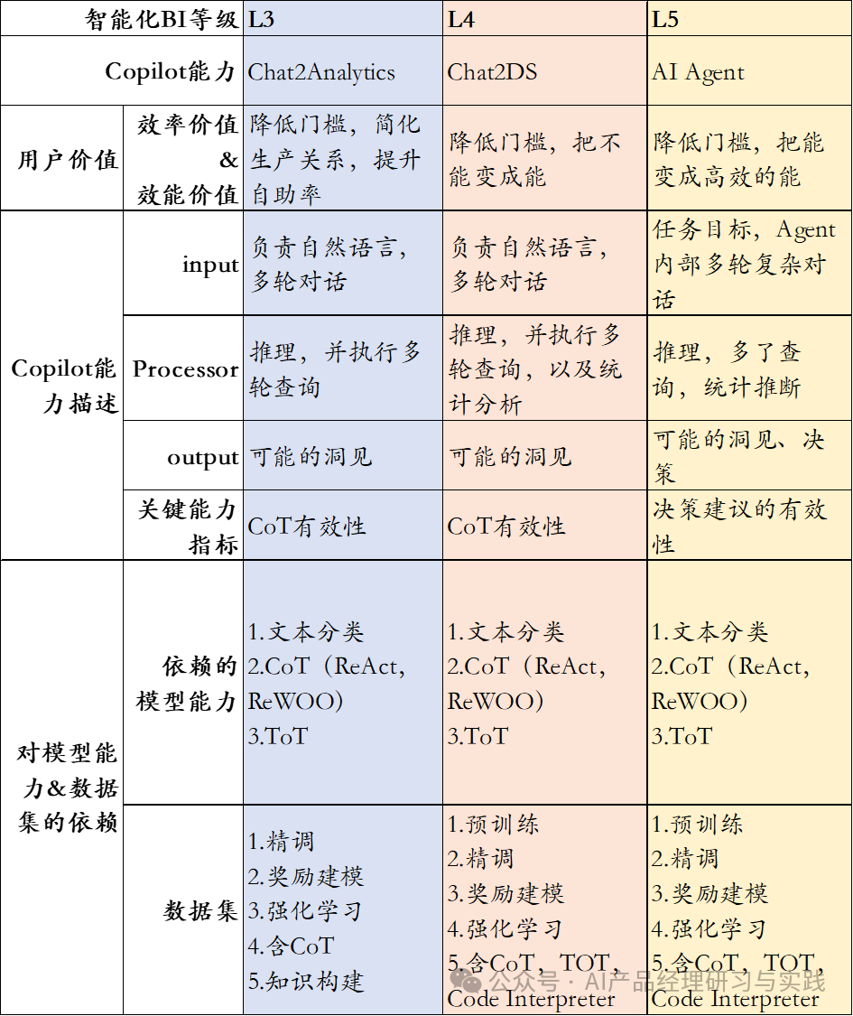 支付宝团队在基于蚂蚁集团基础大模型开发研制数据分析智能助理 Deepinsight copilot的过程中,比较系统化地梳理了结合大模型的数据分析智能助理功能需求,划分了不同的智能化等级,非常值得我们参考和学习:
