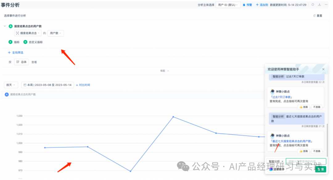 以事件分析场景为例,在输入框中用自然语言输入要获取的数据指标,比如最近7天搜索点击的用户数,GPT 模型将自然语言转化为请求查询JSON 并发起查询,并进行图形化展示。