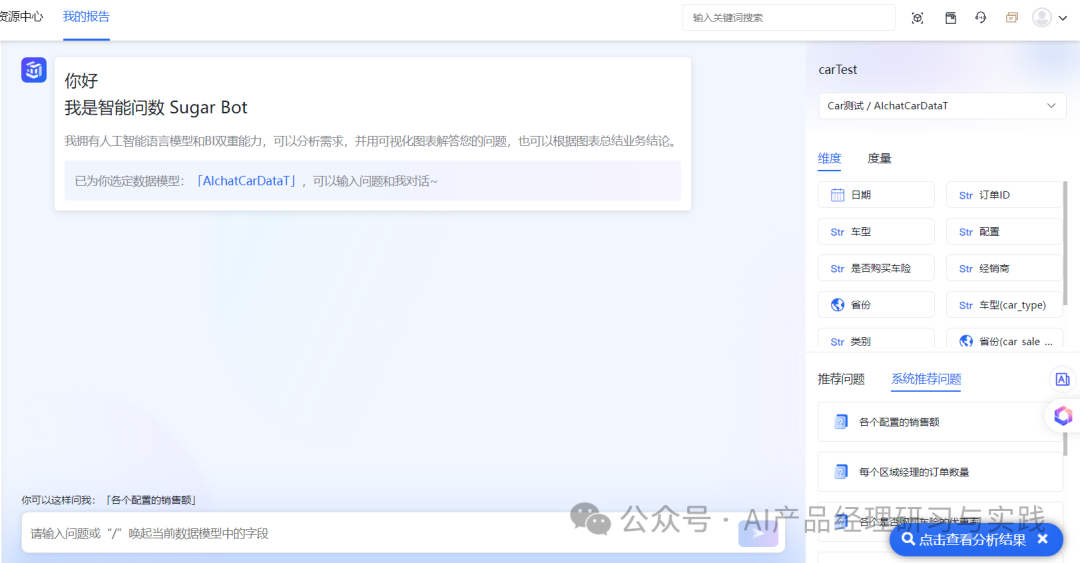 然后我们就可以通过智能问数Sugar Bot和系统进行交互了: