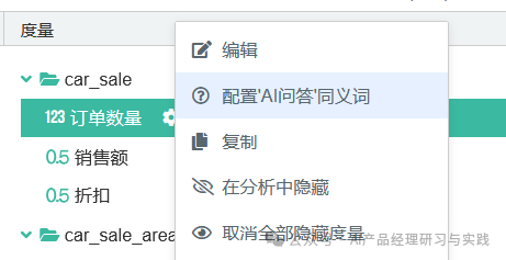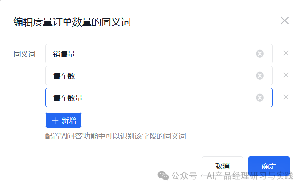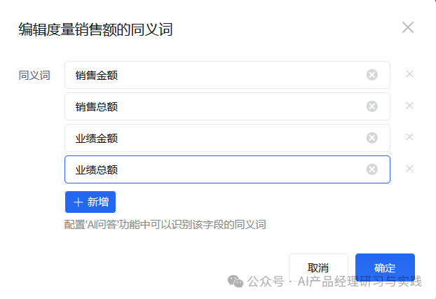 对于原子指标(度量),我们可以设置AI问答的同义词(也就是帮助大模型理解专业术语,可能用户会有不同的问法)作为其“知识库”: