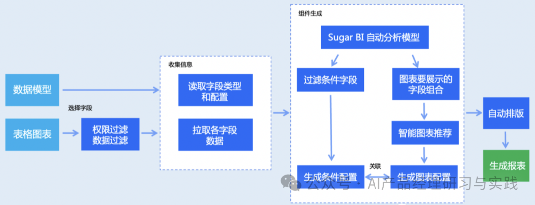 分析模型的运作:收集完必要的信息后,SugarBI会将这些数据输入自动分析模型。这个模型是基于SugarBI内部大量报表数据经过训练得来的,因此具有较强的分析能力。模型会输出两类关键信息:一是数据过滤条件的优先级排名,二是图表展示字段组合的推荐排名。
