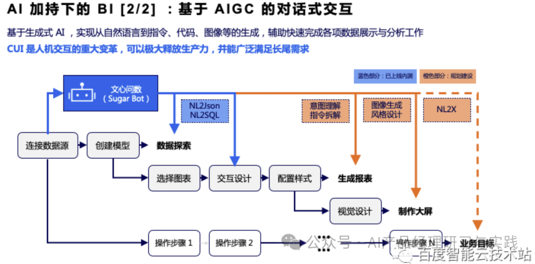 基于 NL-to-JSON 等能力,文心问数 Sugar Bot 帮助用户基于对话来直接完成数据探索,并完成一部分报表制作功能。同时,该团队还在进一步研发意图理解、指令拆解、图像生成等 AIGC 能力,基于对话直接满足用户对报表、大屏的生成需求,其愿景是实现大部分内容的直接生成,也就是 NL-to-X 。这样,可以通过生成式 AI 直接满足更多用户业务目标,逐步实现业务与技术重构。
