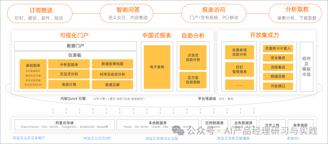 - AI赋能: 自动根据问题生成SQL、JSON,利用AI生成文字结论、可视化图表和行动建议,实现问答式BI。