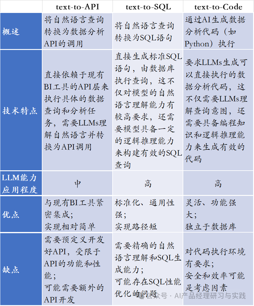 - text-to-SQL是一种较为通用和强大的模式,可以直接利用数据库的强大查询能力。然而,它对大语言模型转换自然语言到精确的SQL语句的能力有较高要求,可能需要进行较多的定制和优化,特别是在处理复杂查询时。此外,SQL查询的性能优化也是一个需要考虑的重要因素。它适用于基于标准SQL数据库的数据分析,特别是在数据结构清晰、查询需求标准化的环境中。对于希望利用现有数据库能力,而不依赖特定BI工具的企业来说,这是一个较好的选择。