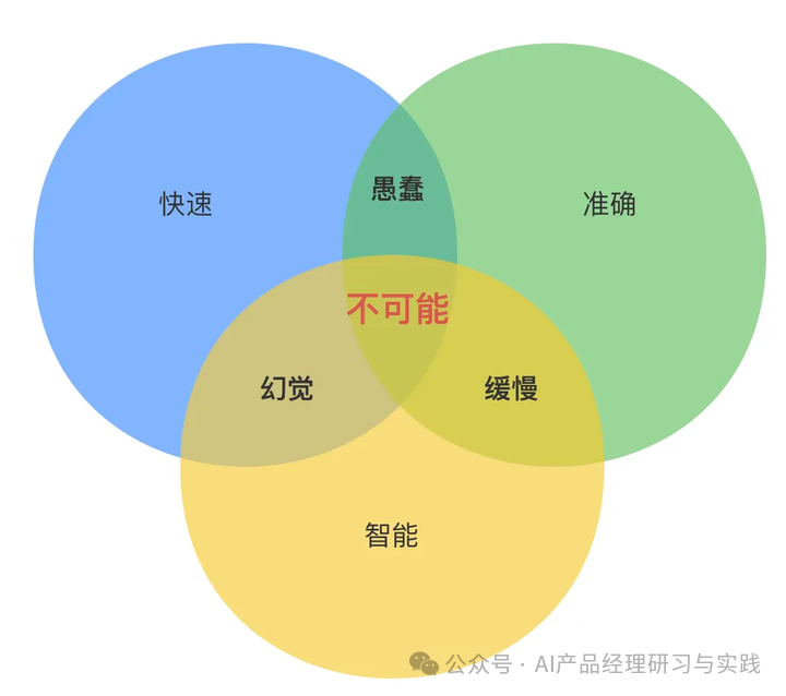 在不断地妥协之后,我们感觉在 AI 应用落地中存在一个不可能三角,效率-准确-智能的不可能三角。希望能够快速且准确地解决问题,就会对复杂问题束手无策;需要准确地解决复杂问题,就会需要漫长的时间来思考、拆解、处理;希望能够快速地解决复杂问题,就会无可避免地面临幻觉的产生。