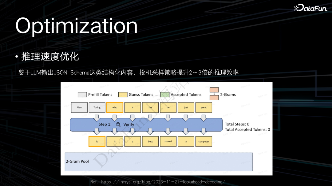 对于这种 Json 结构,如我们现在一般会用一个 n-grams 模型来作为小模型去做候选词的生成,它去被大模型采纳的概率是非常大的,在评估中,一般都能提升二到三倍的推理速度。后续也会考虑其它的优化方案。