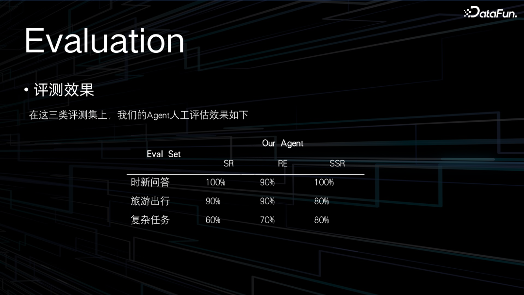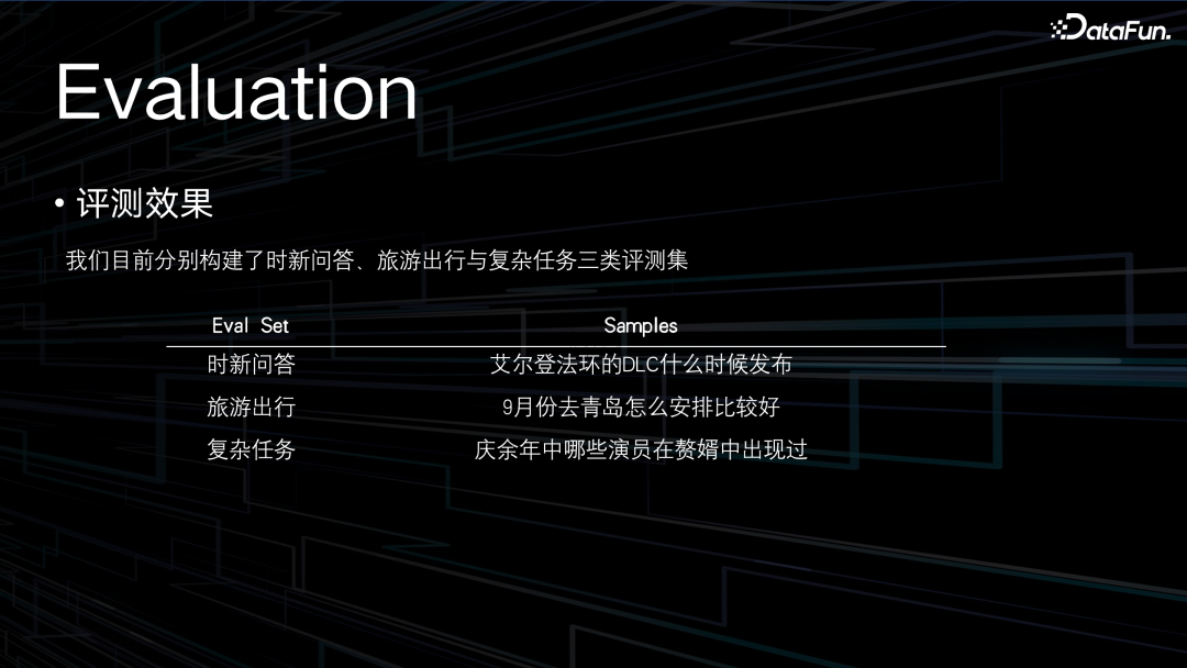 我们的内测 demo 构建了三类评测集,一个是时新问答,就是调用搜索引擎,根据搜索引擎的结果去做一些回复;第二个是和我们产品需求贴合得比较紧密的旅游出行,看起来比较复杂,但它毕竟是一个串行的流程,只需要按步骤完成任务,最后做一个总结,对于大模型并不属于复杂任务;我们定义的复杂任务,是需要对拿到的信息去做一个总结或对比才能得到答案的任务。